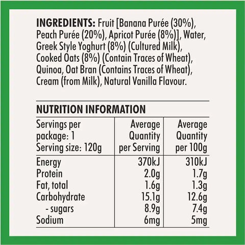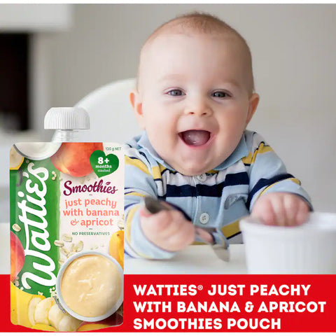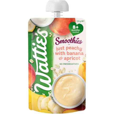 Wattie's smoothies just peachy with banana & apricot, blends banana, peach, apricot, greek style yoghurt and oats into a tasty breakfast for babies aged 8+ months. Serve cold or heat in the pouch in hot water until warm and squeeze onto a spoon.
