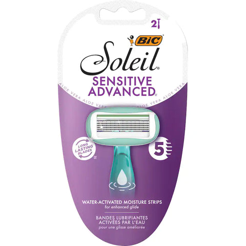 The bic soleil sensitive advanced razor features 5 flexible blades that adjust to your curves to deliver a flawlessly smooth shave. The bic soleil sensitive advanced razor also features 360° water activated moisture strips for an enhanced glide. The pivoting head and rubber handle provide added control while the enhanced comfort shield helps protect against irritation.