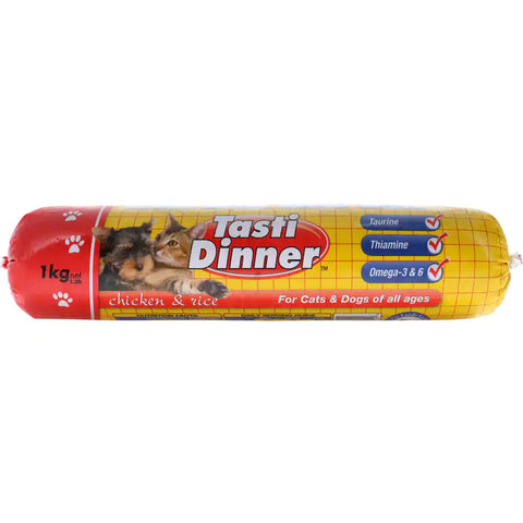 This smaller 1kg roll is suitable for cats & dogs of all ages. The roll is prepared from a mix of beef and lamb, plus rice, eggs & vegetables. There is no added soy protien in tasti dinner.