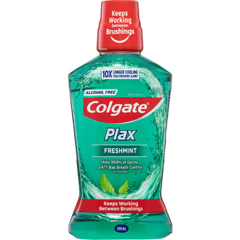 Colgate plax mouthwash fresh mint kills up to 99. 9% of germs and used twice daily provides 24/7 bad breath control for long lasting freshness.