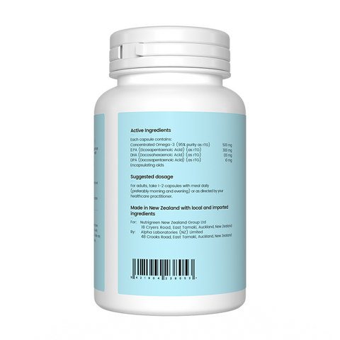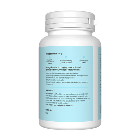 Omega Booster is a premium dietary supplement highly concentrated with 95% Omega-3 fatty acids. Each capsule contains 500 mg of Concentrated Omega-3 (95% purity as rTG), including 300 mg of EPA (Eicosapentaenoic Acid), 120 mg of DHA (Docosahexaenoic Acid), and 10 mg of DPA (Docosapentaenoic Acid).